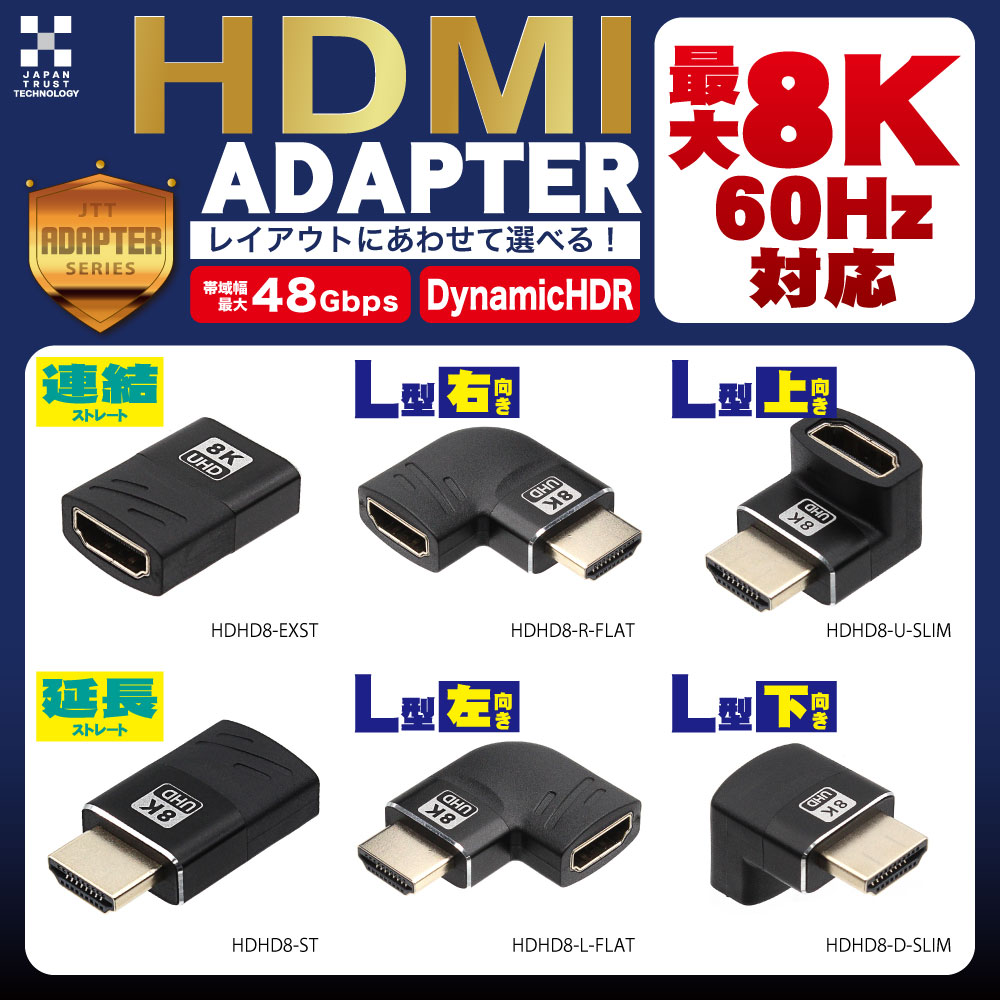 | 型 番 | 直角左 FLAT / HDHD8-L-FLAT 直角右 FLAT / HDHD8-R-FLAT 垂直上 SLIM / HDHD8-U-SLIM 垂直下 SLIM / HDHD8-D-SLIM ストレート / HDHD8-ST 連結ストレート / HDHD8-EXST |