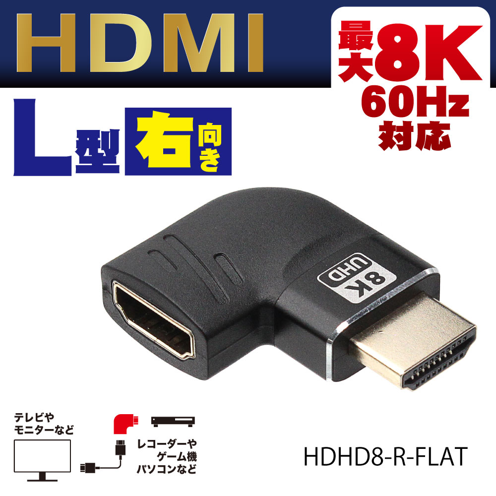 HDMIコネクターの向きを右向きに変換、薄型テレビやモニターの背面など縦にHDMIの並ぶ機器でも便利なL型フラット変換コネクターです。