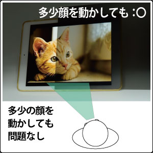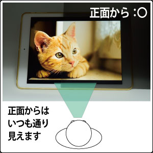 ディスプレイの正面からはクリアに画面が見えますが、隣の席など、60度(左右30度)以上の角度がつくと画面が黒く見えます。