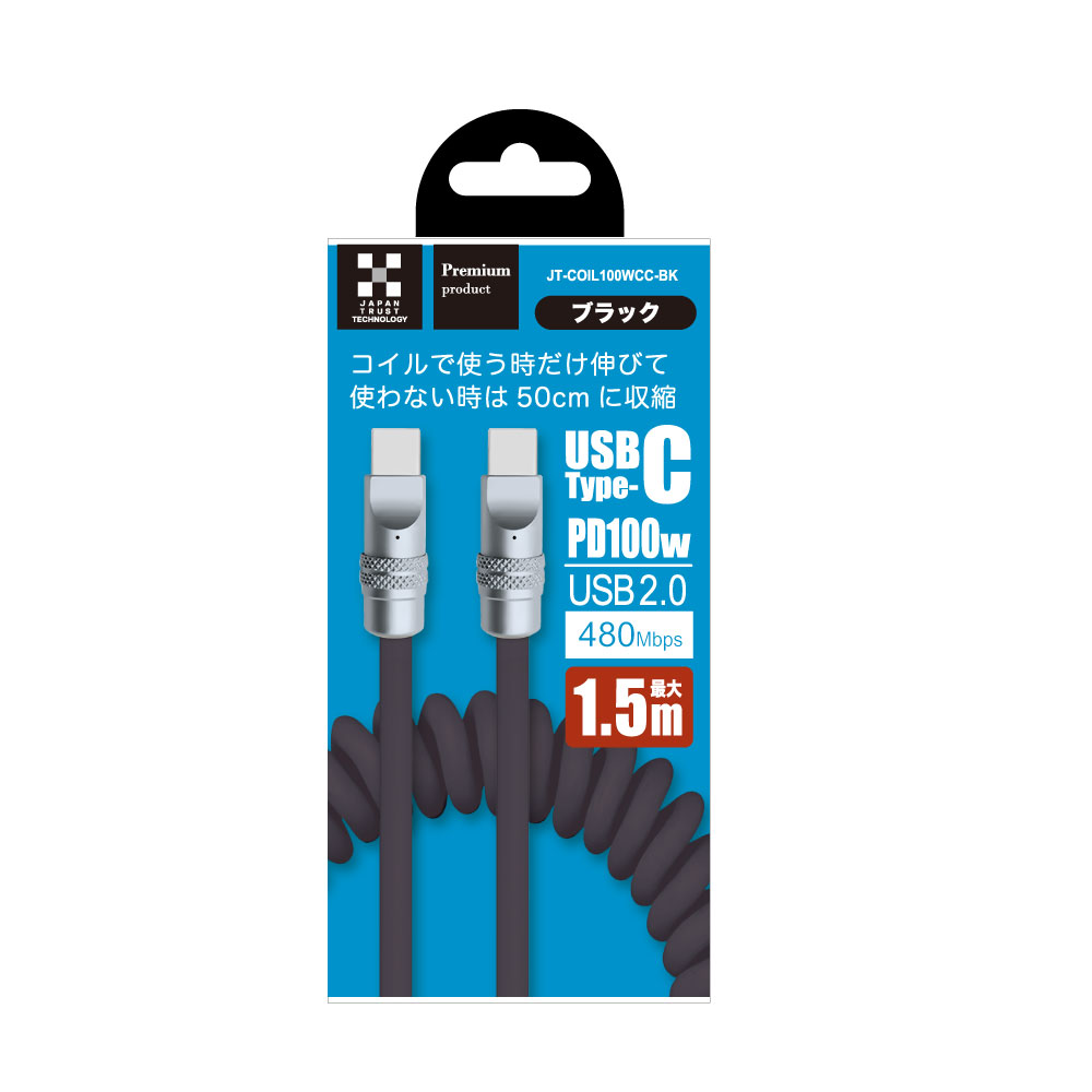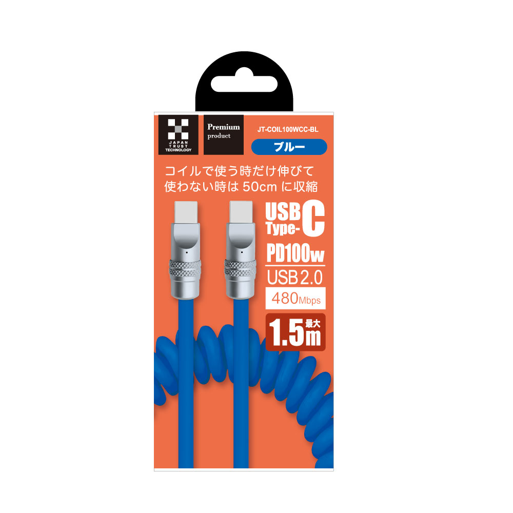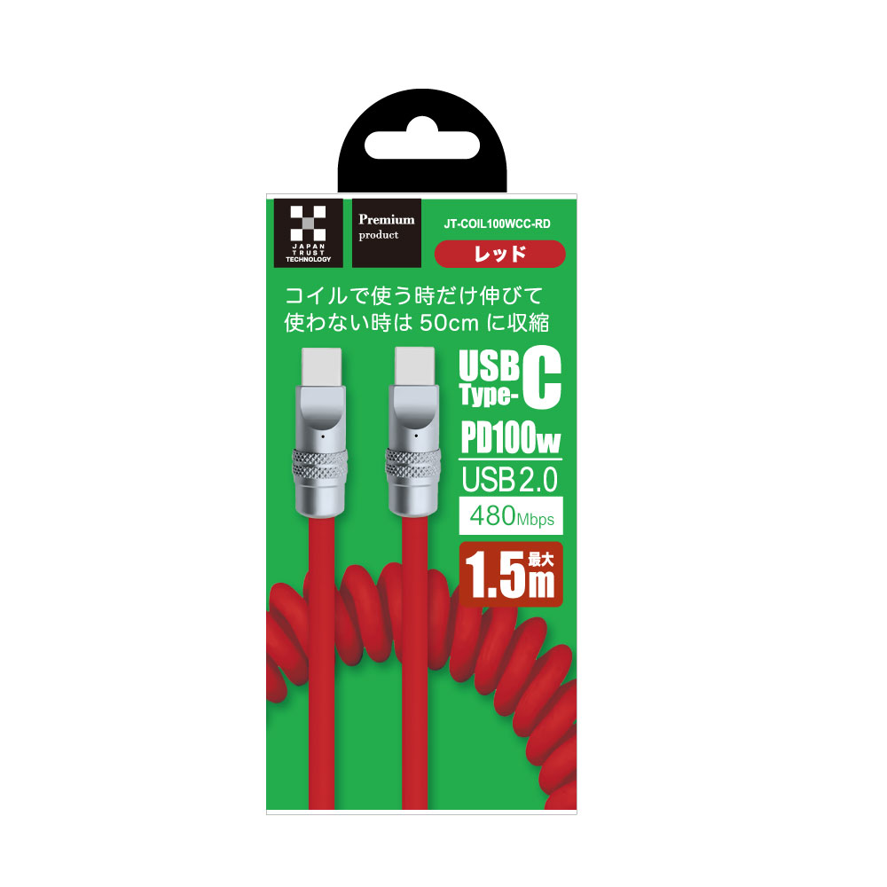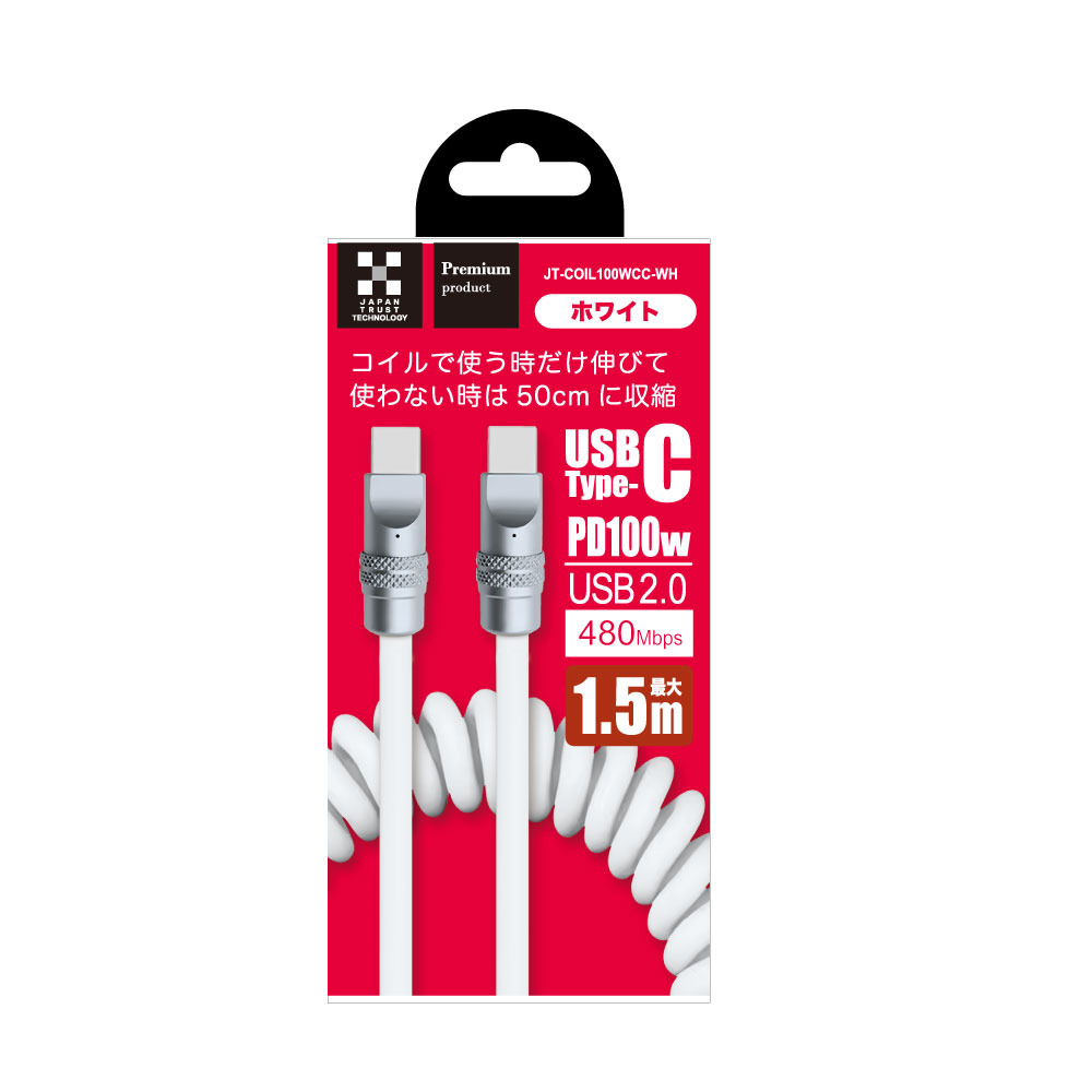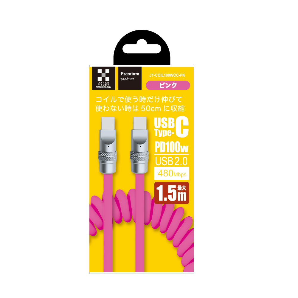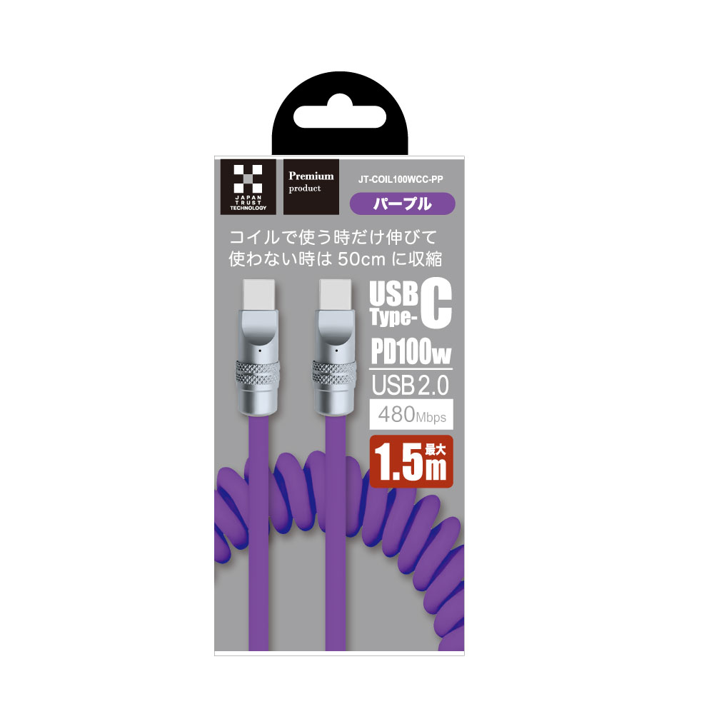 必要な時にグイッと引っ張って伸ばせる、伸縮性に優れたコイル形状のPD充電対応USB-C to USB-Cケーブルです。しなやかなシリコン素材により、使用後は自然に元の形状へ収縮し、最大100W(20V/5A)の高速充電に対応し、ノートパソコンからスマートフォンまで、これ1本でスマートかつ効率的な充電環境を構築します。
