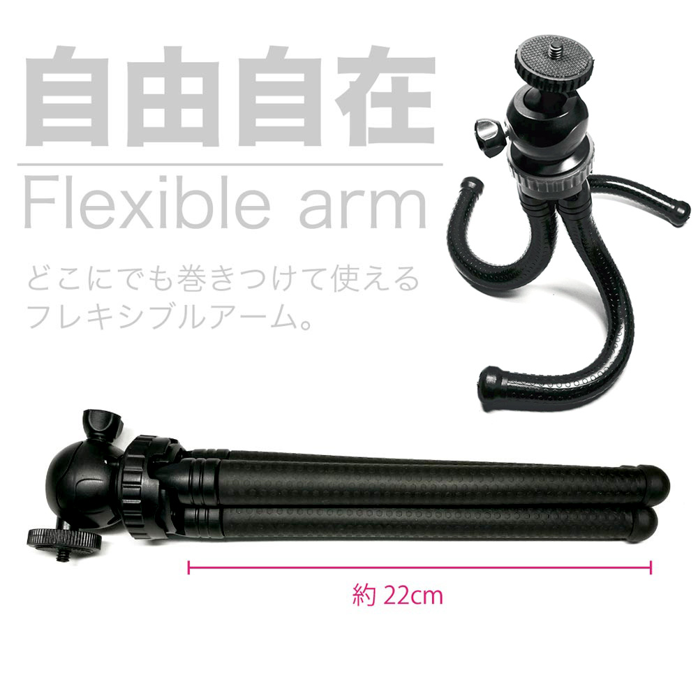 ■カメラ用三脚ネジ対応機器を取付可能■大型ボールマウントと3本の大きなフレキシブルアームを利用して自由自在に角度調節が可能です。■アーム部分が約22cm■オプションのスマートフォンホルダーを利用してスマホ三脚としてもご活用いただけます。