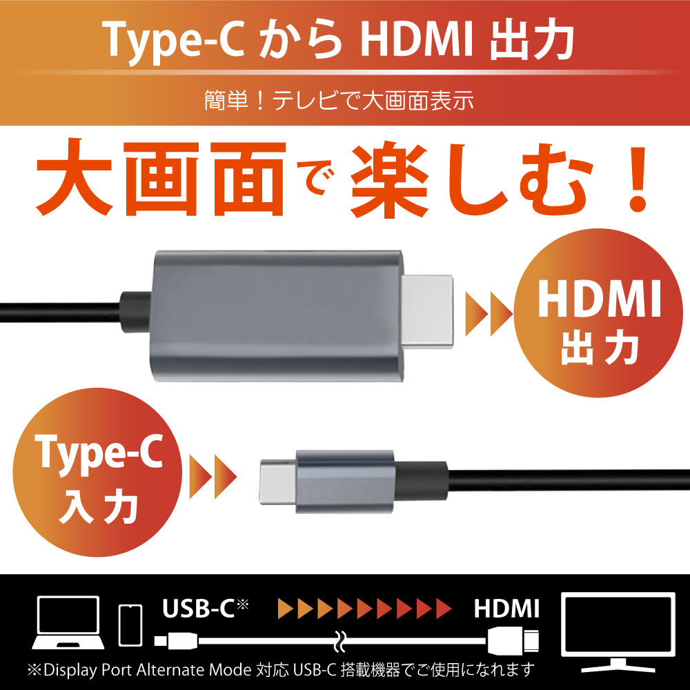 DisplayPort Alternate Mode対応のType-Cポート搭載機器(PCやスマホなど)の画面をHDMI接続したテレビに出力するケーブルです。