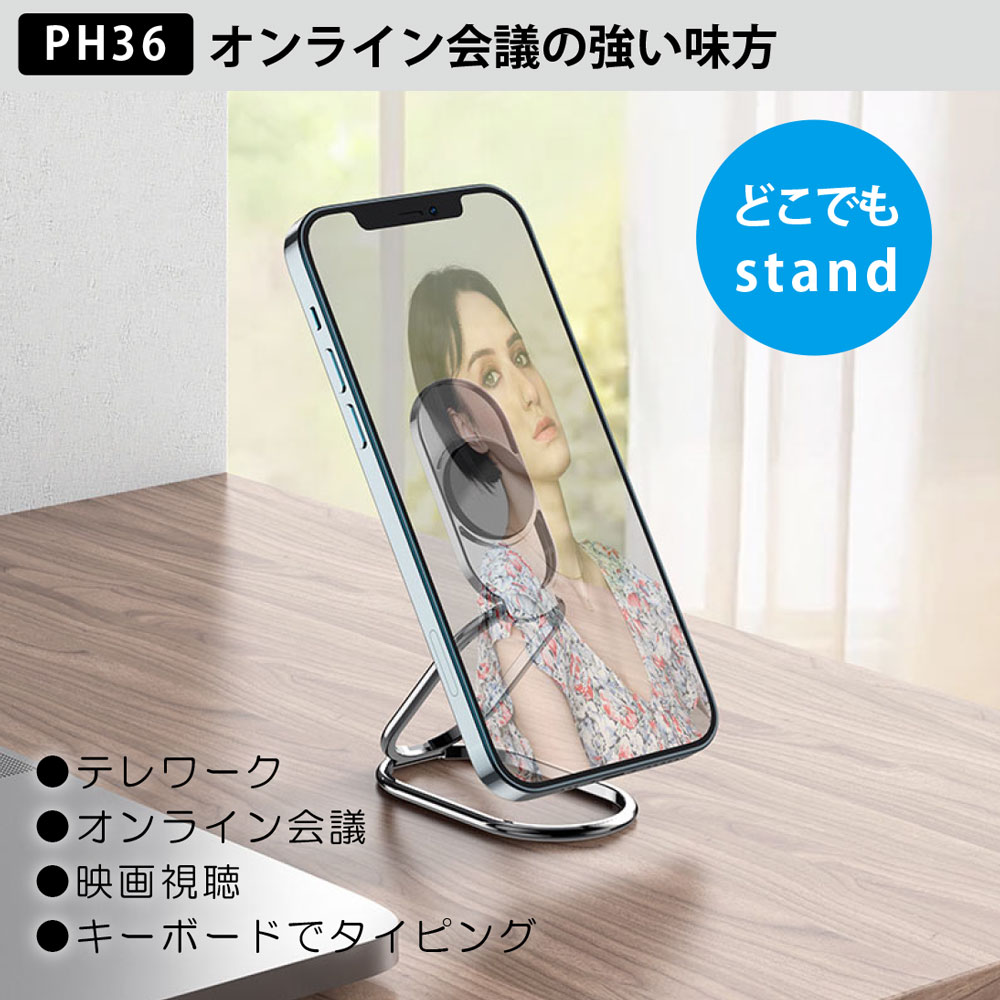 メタルフレームでつくられた、2つのリングが、伸ばしてスマホリング、折り曲げてスマホスタンドに早変わりします。 本製品とスマホの設置部分が360°回転するので、縦、横どちらのスタイルでもご利用いただけます。 また、リングも曲げることで、スマホスタンドになるので、テレワークなどオンラインでの打ち合わせなどにも便利です。 ・サイズ: 収納時:約70×42×4mm 展開時:約185×42×4mm ・重 量:約48g ・対応サイズ:7インチ未満のスマートフォン
