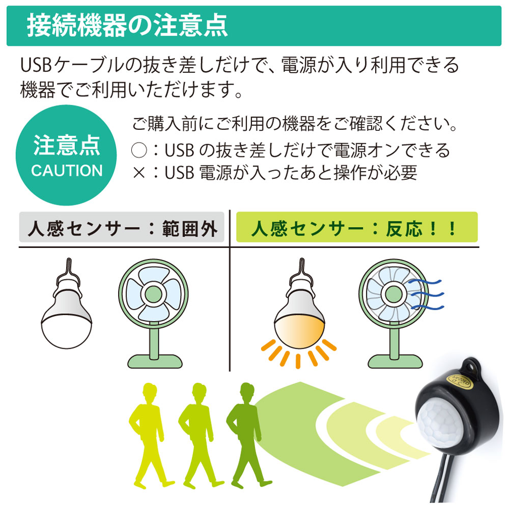 本製品は、光センサーで周囲が暗くなってから、赤外線で人の動きを検知して、 USB電源の通電をオン/オフします。 LEDライトや防犯グッズ、電子工作のスイッチとしてご利用いただけます。 人感センサーの検知範囲は、約5m(約120度)で人の動きを検知します。 ※周辺温度と人の体温が近い場合、検知範囲が短くなります。