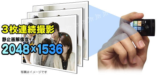 | 一度の撮影で、静止画を3枚連続して撮影してくれる連射機能が付いているので、手ぶれや被写体が動いた事によるブレなどの撮影ミスを防いでくれます。 |