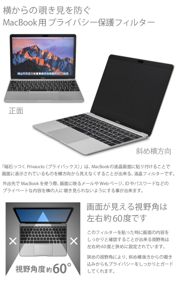 12インチ液晶 Apple MacBook [2015/2016/2017]専用のプライバシーフィルター。いつでもフィルターの付け外しが出来るマグネット式。ブルーライトカット機能対応。 |