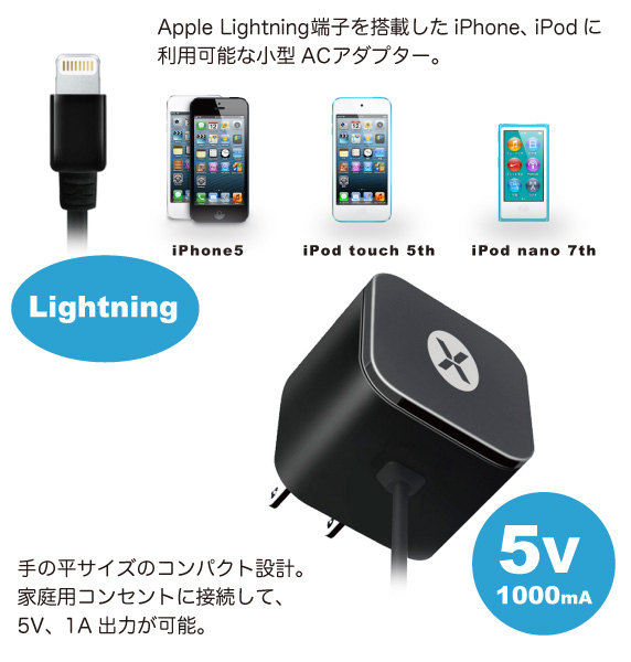 家庭用コンセントから、iPhone5、iPod touch 5th、iPod nano 7thを充電することが出来る、ACアダプターです。