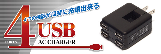 「USB AC チャージャー 4P」は、パソコンが無い場所でも、コンセントに挿すとUSB機器を充電することが出来るUSB