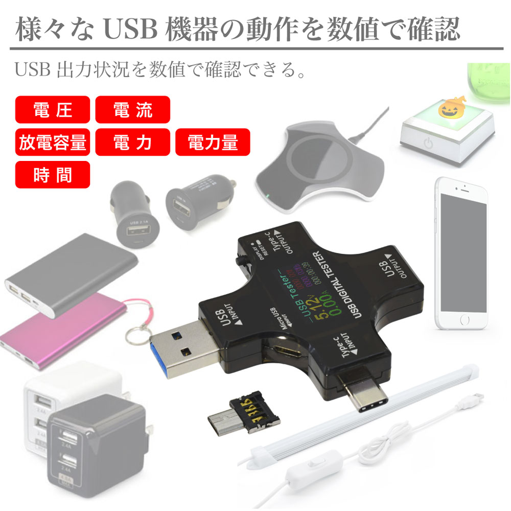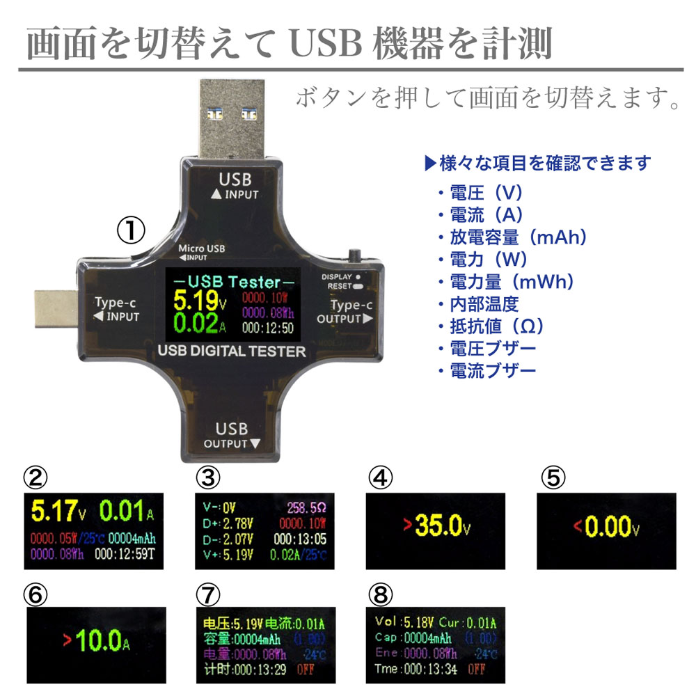 本製品は、各種USBの電圧(V)、電流(A)、放電容量(mAh)、電力(W)、電力量(Wh)などを計測することができるUSB簡易計測器です。