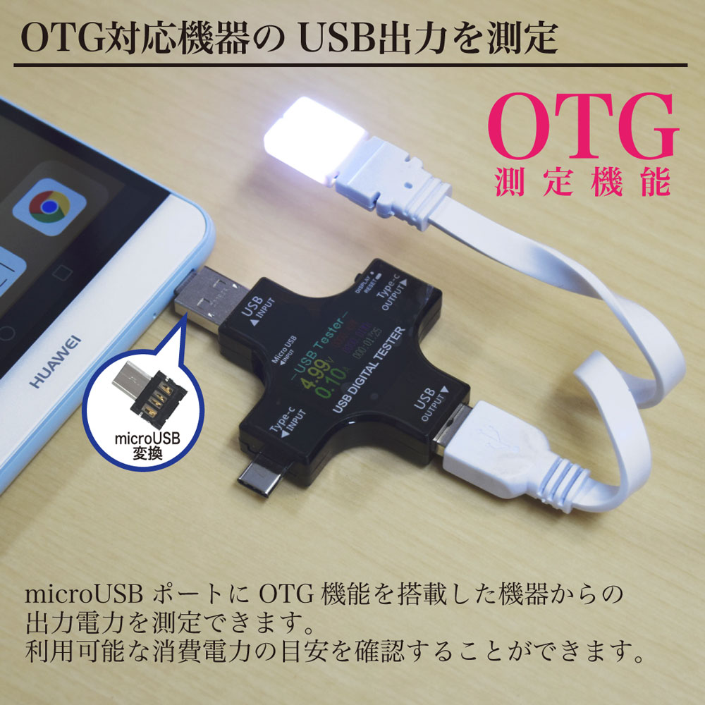 OTG機能に対応したmicroUSBポート搭載スマートフォンやタブレットの出力電力を測定することができます。