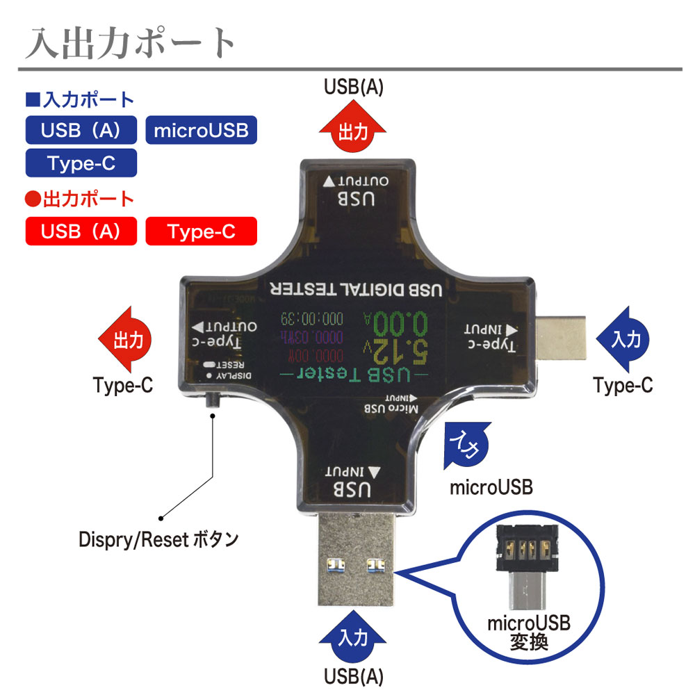 本製品は、3つの入力ポート(USB/microUSB/Type-C)と、2つの出力ポート(USB/Type-C)を利用して接続機器の 動作を数値で確認することができます。