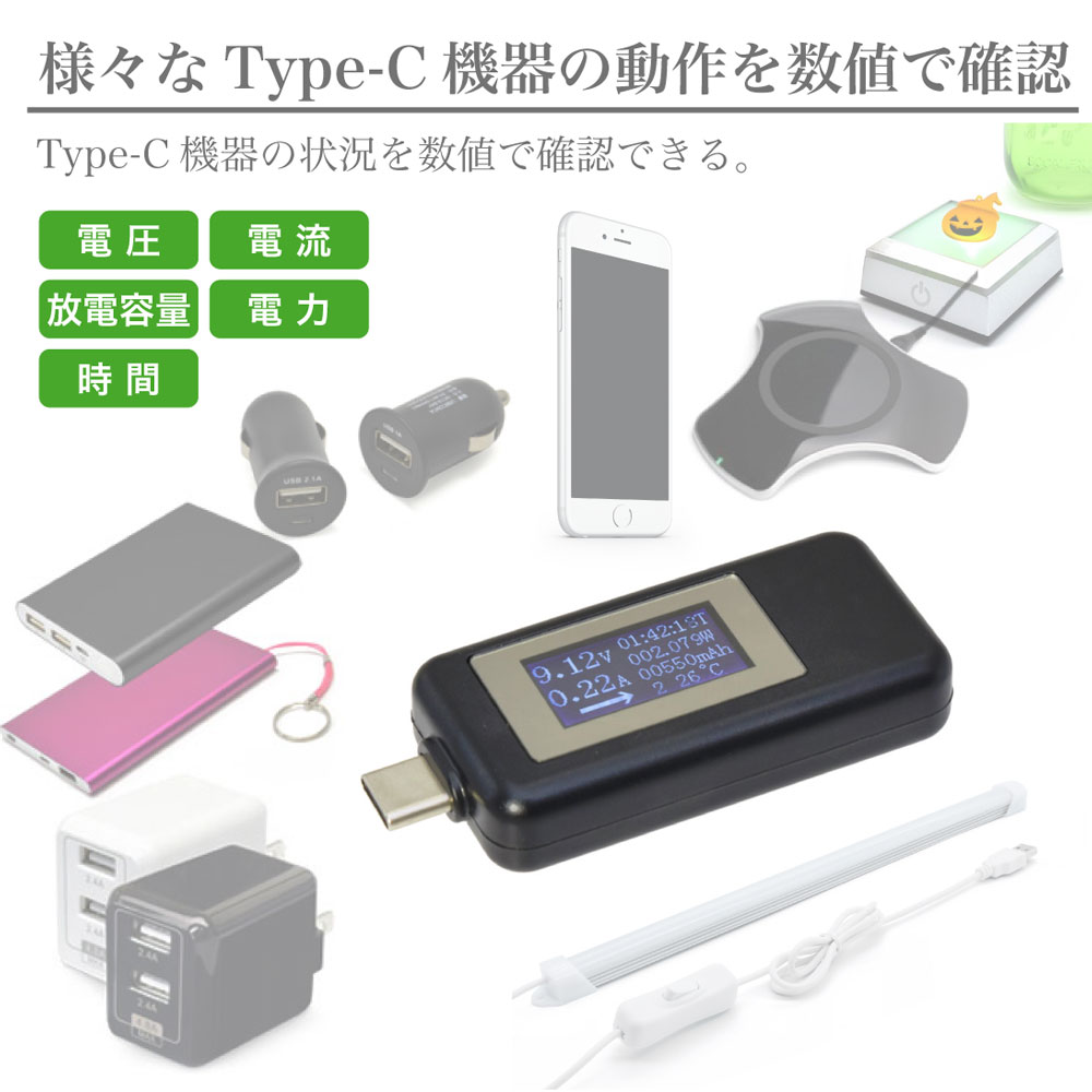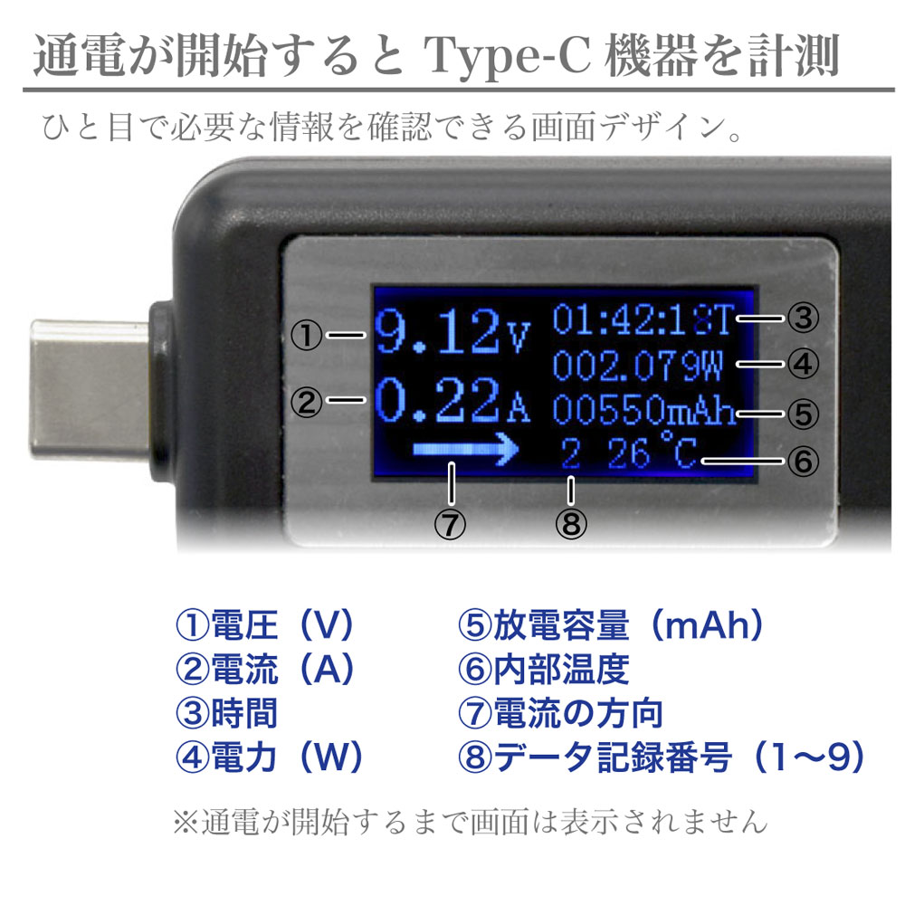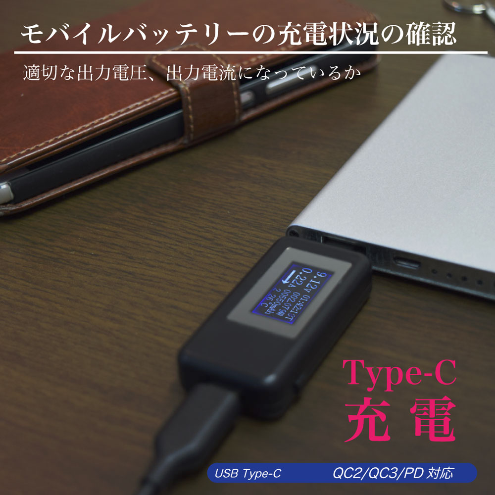Type-C充電には、QuickCharge2.0/3.0やPD充電など様々な急速充電の規格があり、接続機器を最適な電圧と電流で充電する仕組みとなっております。ご利用の充電器と接続機器が適切な電圧、電流で充電されているか確認することができます。