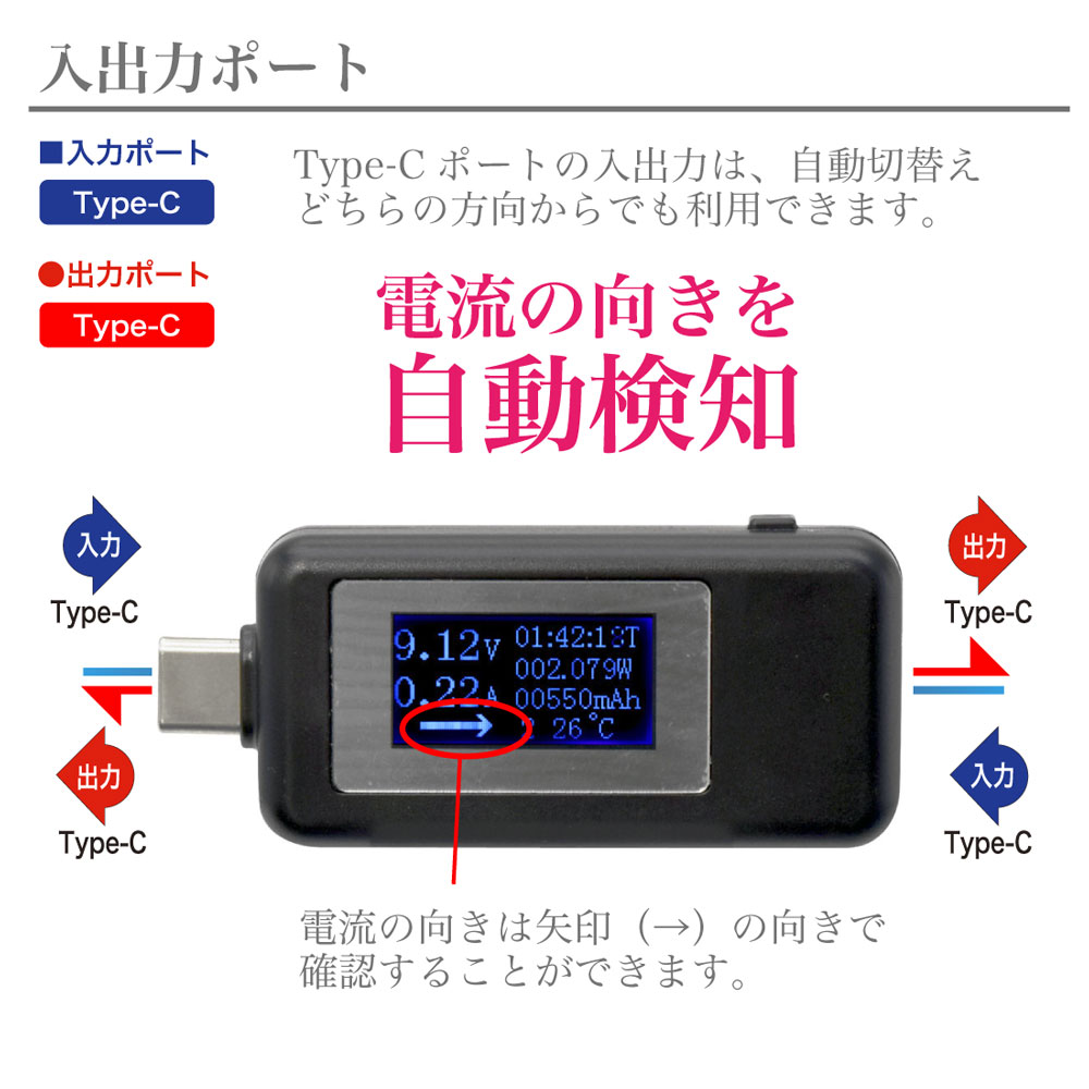 本製品は、Type-C(オス)とType-C(メス)の2つのポートがあり、ごちらのポートに接続しても自動で電流の方向を確認して、計測を開始いたします。